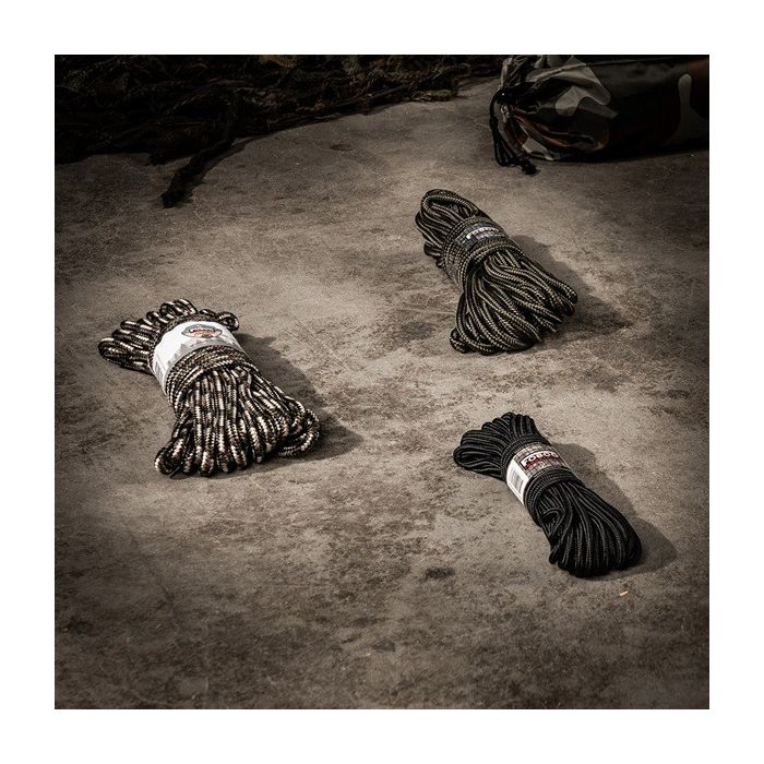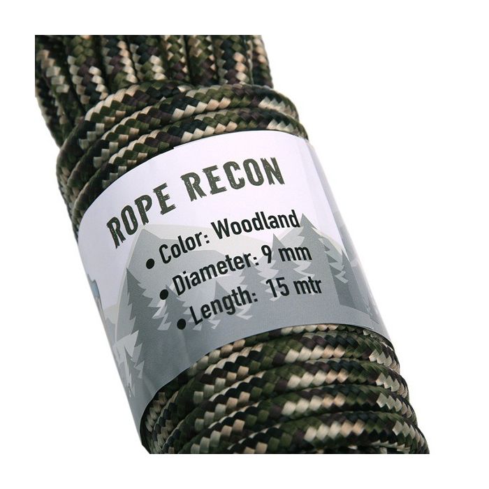 Fosco commando touw 9 mm in de kleur woodland. Materiaal is 100% nylon. Afmeting is 15 meter. Gewicht: +/- 555gr.