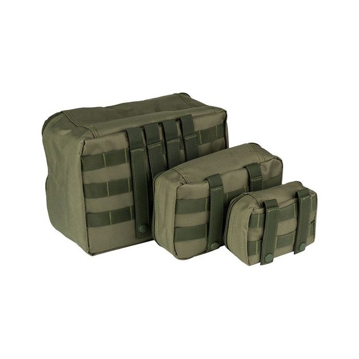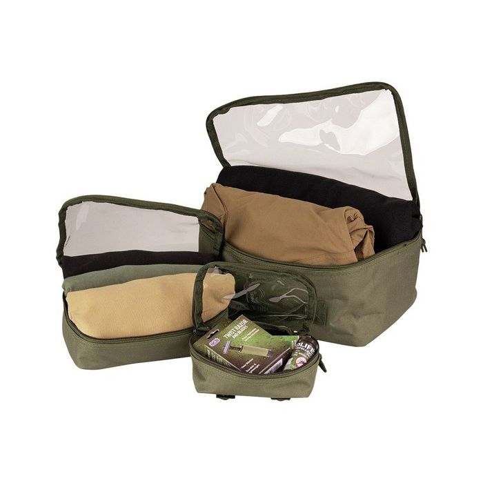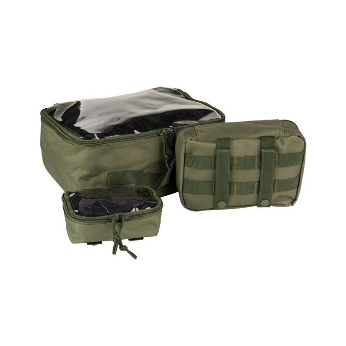 101-INC spullen organizers in de kleur groen. Materiaal: 100% polyester. Kenmerken: De 3 opbergtassen hebben een transparant bovenstuk zodat je kunt zien wat er in zit en verschillende MOLLE-lussen om aan een rugtas te bevestigen. Ideaal voor onderweg.