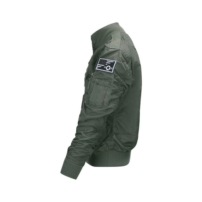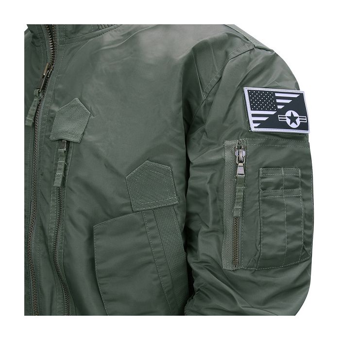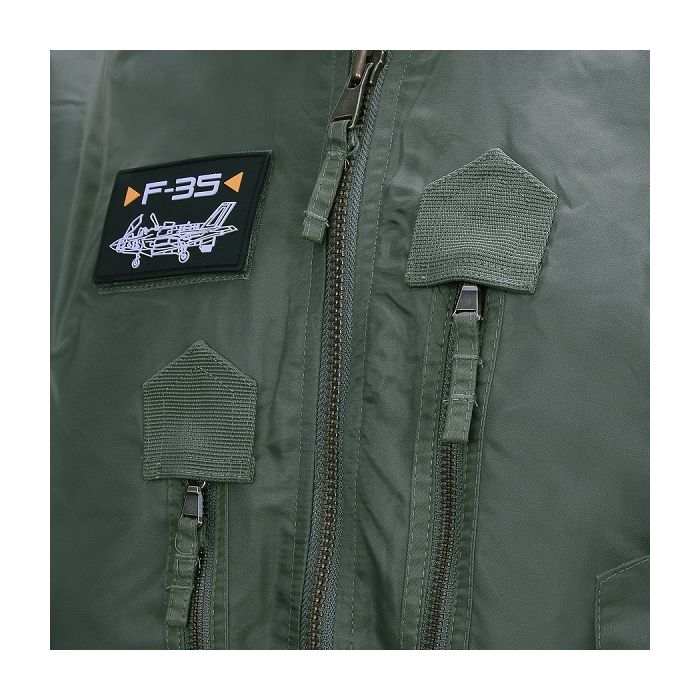 ostex F-35 Flight Jacket in de kleur groen. Materiaal: 100% Nylon. Het bomberjack heeft een elastische boord voor de hals en mouwen en twee steekzakken met klittenband sluiting. Het jack heeft geventileerde oksels en 3 afneembare patches (je kunt ook je eigen patches plaatsen) en twee zakken met rits. De linkermouw heeft een pennen opbergvak.