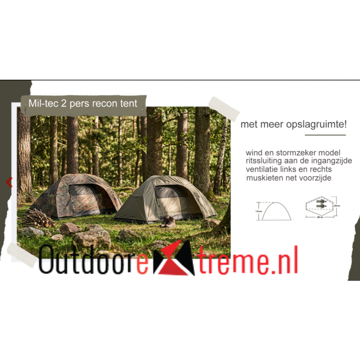 Als je je een goede tent zoekt waar je naast goed slapen en kamperen ook nog wat ruimte hebt om je spullen op te slaan is de Mil-tec recon vommando tent een goede keus. De tent is ruim en iedeaal voor kort kamperen of tijdens een hike of survival tocht met je pratner.