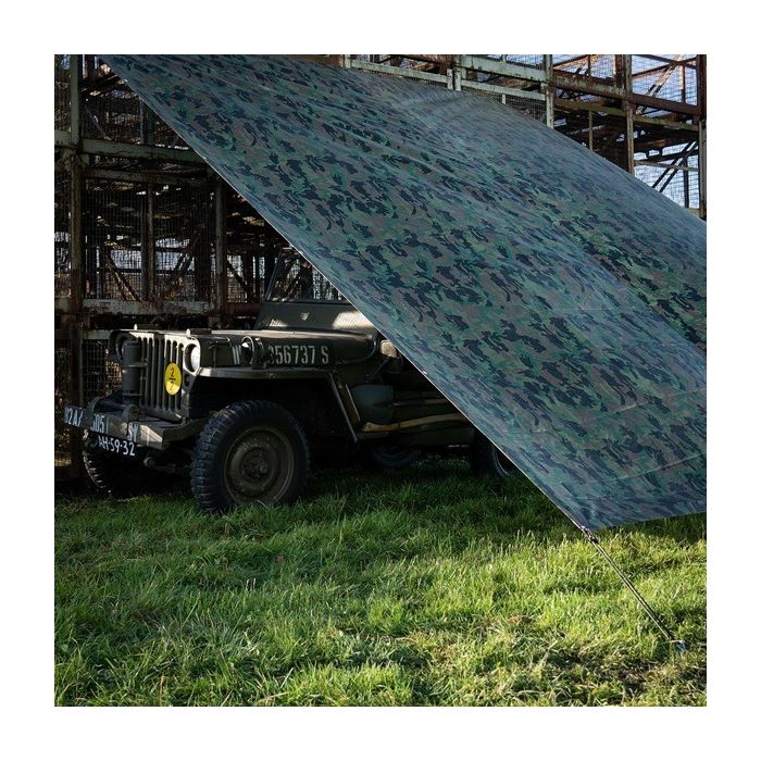 Mil-Tec afdekzeil in de kleur woodland. Afmeting is 2x3 mtr. Materiaal is 100% polyester met een polyethyleen toplaag. Gewicht 120gr/m2.